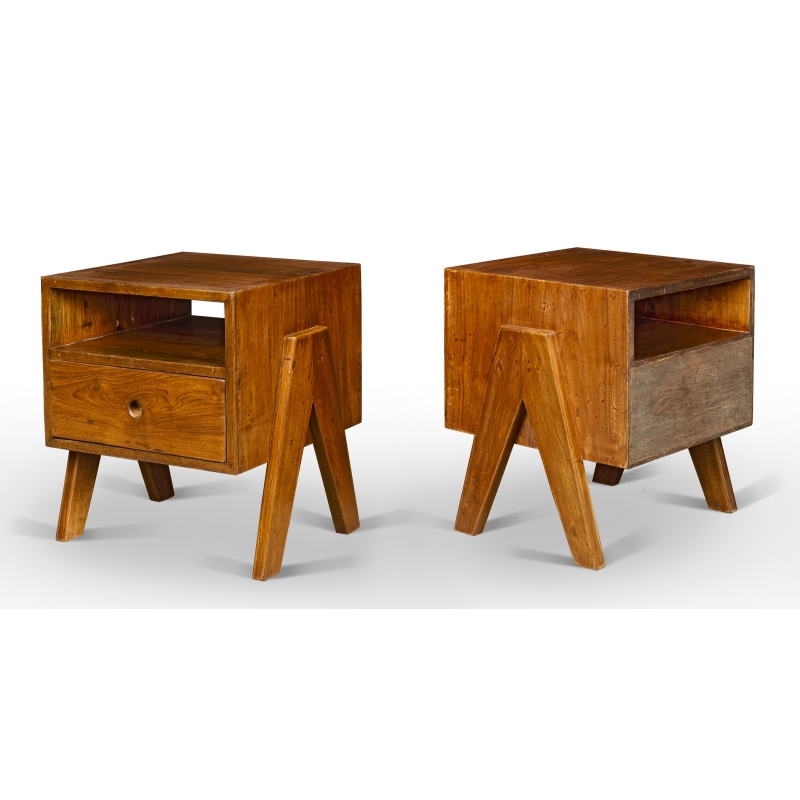 Unit known as "bedside table" in solid teak. Quadrangular body with an open compartment and drawer with opening grip in the shape of a hollowed-out circle on an aluminium background, typical of the work of Pierre JEANNERET in Chandigarh. Pair of "compass" type legs affixed to the sides of the body.