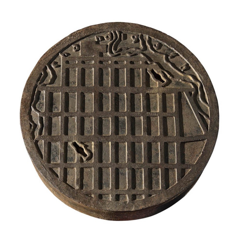 Cast iron manhole cover. Sand-moulded cast iron imprinted with a grid of the city of Chandigarh, drawn in 1951 by LE CORBUSIER. Model A with print-style, spaced typography.