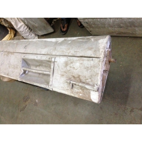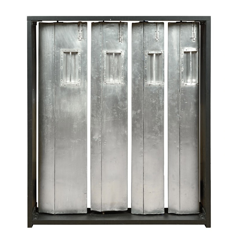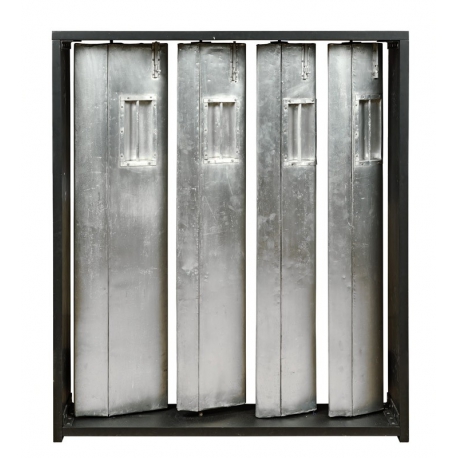 Suite de quatre volets aérateurs verticaux en tôle d'aluminium pliée et rivetée. Profilés à la forme d'une aile d'avion et montés aux extrémités sur pivots en acier permettant la rotation et donc la régulation de l'air.